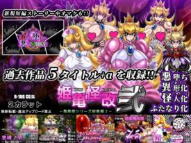 あのお姫様を魔改造してしまうCG集の総集編第二弾!過去作5タイトルに加え、支援サイトで公開した短編などを収録。作品紹介・【NEW】産マレ堕チル悪ノ亀姫達支援サイトで配信した短編ストーリー。亀桃姫によって一同に集められた異世界のピ○チ姫達。亀桃姫の毒菌によって一人、また一人と毒牙にかかっていく。毒菌により身体を、そして心までも改造されるピ○チ姫。ピ○チ姫達の運命は・・・?本編54ページ・悪桃ノ華 〜Re・Birth〜またもや大魔王に捕らえられたピ○チ姫。しかし、謎の変身アイテムを授かり大魔王の城を脱出。無事に王国へ戻ってきたピ○チ姫だったが・・・・・。一時的にカメ族へと変身できるアイテムに魅了されたピ○チ姫は、欲望に流されるまま自らを快楽に侵食させていく。そしてそれに答えるかのように変身アイテムは更なる変身をピ○チ姫に与えるのだった・・・。「変態進化」という変身を・・・・。本編65ページ・毒魔蟲ノ桃華改姫様を蟲の怪人に改造するCG集2弾毎晩、不思議な悪夢を見る姫様。現実とも夢とも区別がつかないその悪夢によって、身も心も蝕まれていく・・・。次第にその悪夢に魅入られた姫様は自ら変態することを決める。そう・・・悪臭を放つあの蟲へ・・・・。本編148ページ・VampireHearts 〜血塗られたプリンセス〜1,5ある日のキノコ王国。近隣の姫君を招いてお茶会を計画していたピ◯チ姫だが、何者かによって異次元へと城ごと移転してしまう。逃げ場の無いピ◯チ姫の胸元に装着された魔の変身ブローチ・・・。次第にピ◯チ姫は身体も心も変貌していくのであった。血を求める、あのモンスターに・・・・。本編99ページ(青肌ver. 全身ラバーver.有り)・堕悪魔淫桃幾多の分岐によって生まれる並行世界、アナザーワールド。これはそのifの世界の一つ、道を踏み外したお姫様の物語。何度も囚われ、心に歪みが生まれた姫様は欲望のために処女を、そして国民までをも悪魔に差し出してしまう。姫様が造り出したアイテム「ダークスター」。それは国民達のエナジー、そして敵国の大魔王のエナジーをも吸い取っていく。その力が満たされたとき、姫様は異形のモノへと進化する・・・。本編91ページ・キンタマウイルス魔改造カルテウイルス性の流行り病が蔓延し大忙しの診療所。ですが、ついにドクターが倒れてしまいます。ナース・ピ◯チは新たな薬を作ろうと図書館に向かいますが、そこで不思議な本を見つけます。早速、診療所に戻り本の通りに作った薬を飲み込みます。それが、悪魔の薬とも知らずに・・・。本編156ページ各タイトルに4Kサイズ、フルHDサイズの本編を用意。またPDFでのフルHDサイズ本編を同梱。※下記タイトルと一部重複する内容があります。ご注意ください。・悪桃ノ華 〜Re・Birth〜(232282)・毒魔蟲ノ桃華改(300900)・VampireHearts 〜血塗られたプリンセス〜1,5(353549)・堕悪魔淫桃(496646)・キンタマウイルス魔改造カルテ(657373)